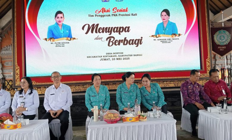 Jbm.co.id-BANGLI | Ketua TP PKK Kabupaten Bangli Ny. Sariasih Sedana Arta mendampingi Sekretaris TP PKK Provinsi Bali Ny. Seniasih Giri Prasta pada acara aksi sosial tim penggerak PKK Provinsi Bali “Menyapa dan Berbagi” di Wantilan Desa Bonyoh Kintamani Bangli, Jumat, 23 Mei 2025.