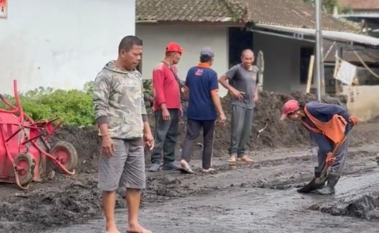 Menurut Artom Krisna, masyarakat sudah sejak dia hari pasca banjir berpacu melawan lumpur itu, agar lalulintas tidak terganggu. Dikatakan sudah dua hari masyarakat bergotong royong.
