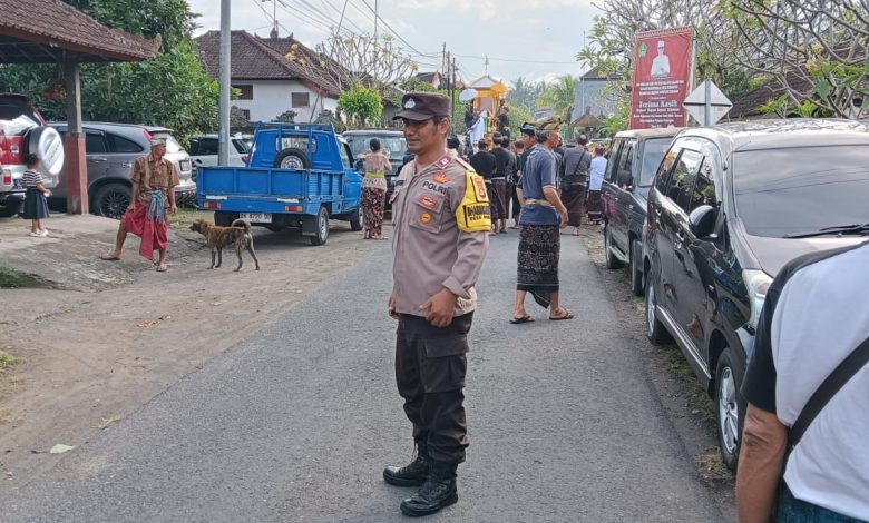 Jbm.co.id-TABANAN | Bhabinkamtibmas Desa Denbantas melaksanakan pengamanan kegiatan pengabenan Pitra Yadnya warga Banjar Adat Celagi, Desa Denbantas, Kabupaten Tabanan, Minggu, 26 Mei 2024.