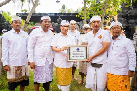 Bupati Adi Arnawa juga melaksanakan persembahyangan bersama dengan krama pengempon Pura serta menyerahkan bantuan dana hibah sebesar Rp 450 juta secara simbolis yang diterima Ketua Panitia Wayan Astika