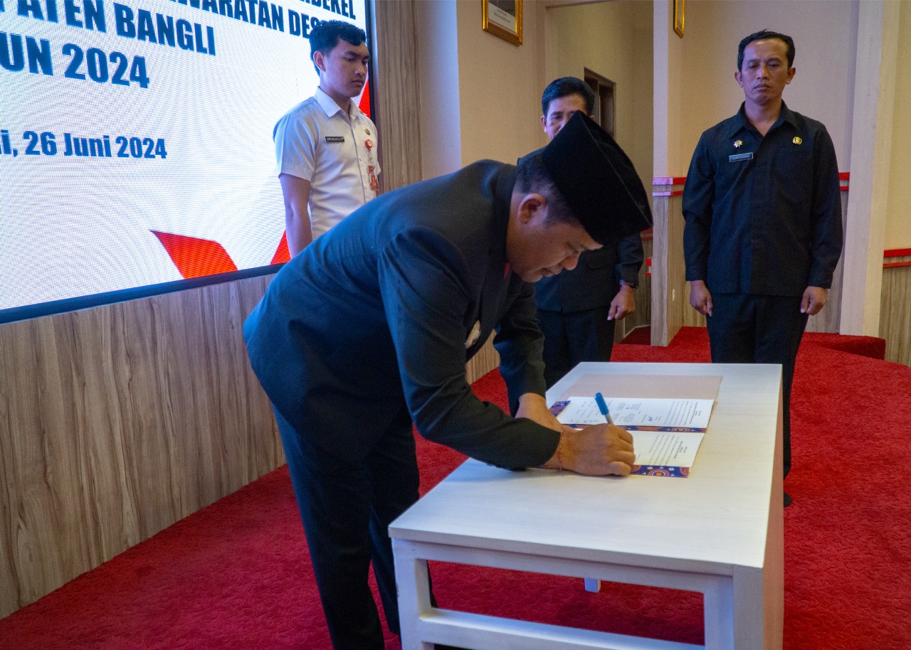 Jbm.co.id-BANGLI | Bupati Bangli Sang Nyoman Sedana Arta mengukuhkan perpanjangan masa jabatan Perbekel dan Anggota Badan Permusyawaratan Desa (BPD) se-Kabupaten Bangli tahun 2024 di Gedung Bukti Mukti Bakti Kantor Bupati Bangli Rabu, 26 Juni 2024.