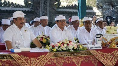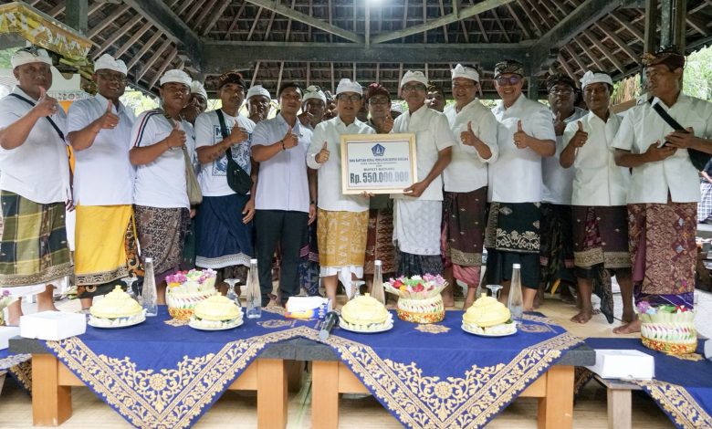 Jbm.co.id-BADUNG | Bupati Badung I Wayan Adi Arnawa menyerahkan bantuan pemulihan dampak bencana Pura Taman Beji Magendra, Desa Adat Tegal Darmasaba, Desa Darmasaba, Kecamatan Abiansemal, Rabu (22/4). Bantuan pemulihan dampak bencana sebesar Rp 550 juta, diserahkan bertepatan dengan upacara mulang dasar perbaikan pondasi penahan tanah. Bantuan diterima Ketua Panitia Pembangunan, I Ketut Subrata bersama panitia dan pengempon Pura.