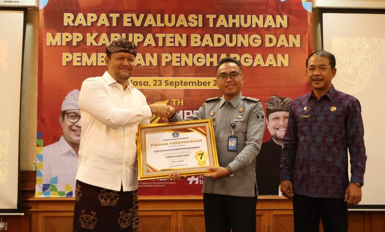Jbm.co.id-BADUNG | Kantor Wilayah Kementerian Hukum (Kemenkum) Provinsi Bali menerima penghargaan sebagai Penyelenggara Pelayanan dengan Kinerja Sangat Baik dalam ajang Rapat Evaluasi Tahunan Mal Pelayanan Publik (MPP) Kabupaten Badung sekaligus peringatan Hari Jadi ke-7 MPP, Selasa, 23 September 2025.