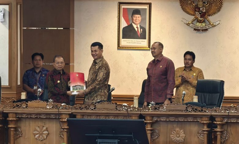 Rapat Paripurna DPRD Bali dipimpin Ketua DPRD Bali Dewa Made Mahayadnya didampingi Wakil Ketua DPRD Bali I Komang Nova Sewi Putra dan sejumlah Anggota DPRD Bali membahas penyampaian Penjelasan Gubernur Bali mengenai dua Raperda Provinsi Bali tentang Tata Kelola Usaha Pariwisata Bali Berkualitas dan Raperda tentang Perubahan Atas Peraturan Daerah Nomor 1 Tahun 2024 tentang Pajak Daerah dan Retribusi Daerah.