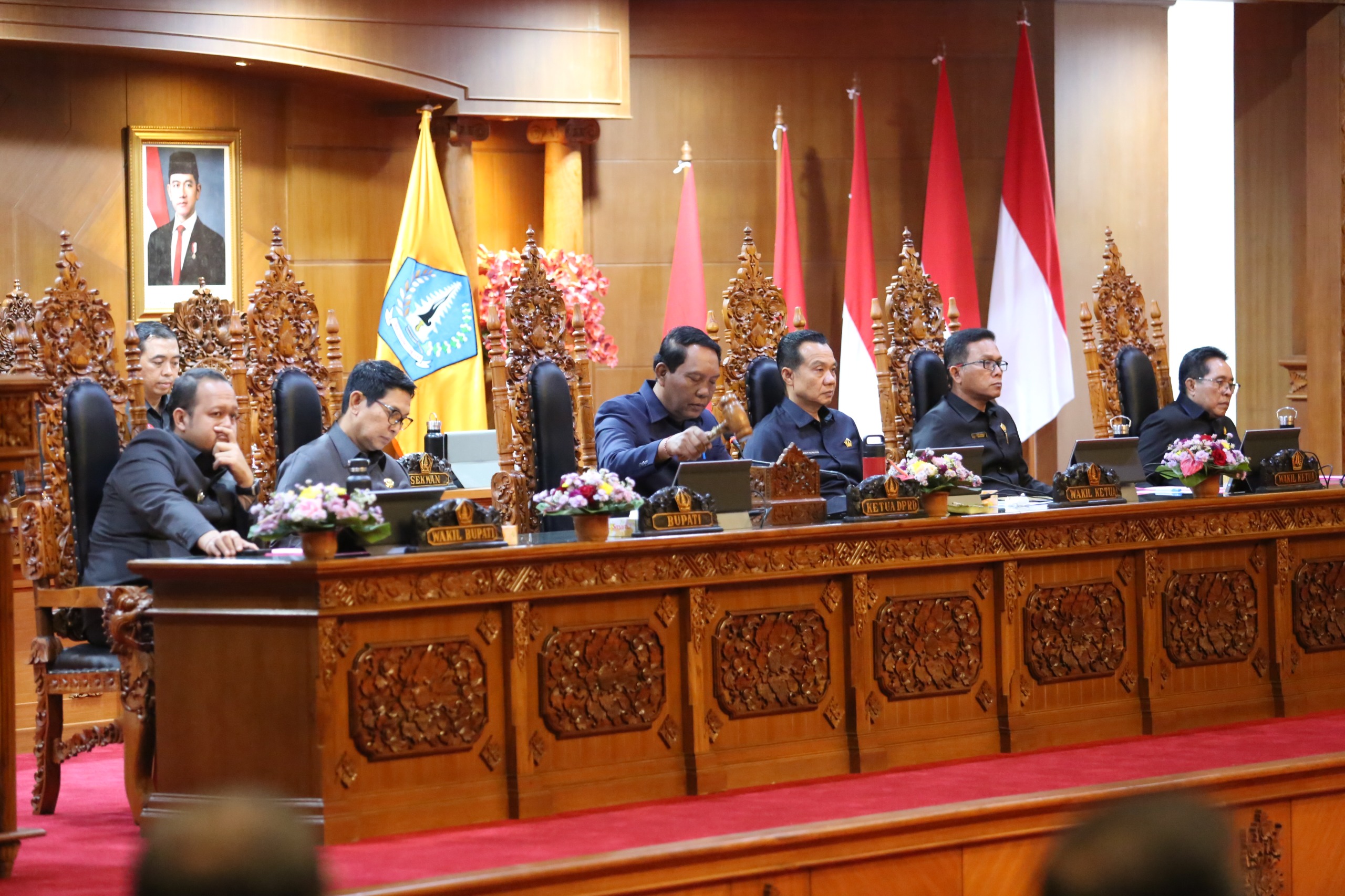 Rapat Paripurna DPRD Badung dipimpin oleh Ketua DPRD Kabupaten Badung, I Gusti Anom Gumanti didampingi Wakil Ketua I DPRD Badung Anak Agung Ngurah Ketut Agus Nadi Putra, Wakil Ketua II DPRD Badung Made Wijaya, Wakil Ketua III DPRD Badung Made Sunarta serta sejumlah Anggota DPRD Badung.