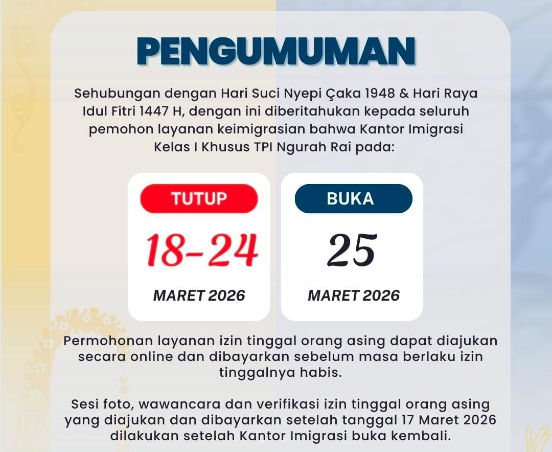 Dalam pengumuman tersebut disampaikan sehubungan dengan Hari Suci Nyepi Çaka 1948 & Hari Raya Idul Fitri 1447 H, dengan ini diberitahukan kepada seluruh pemohon layanan keimigrasian bahwa Kantor Imigrasi Kelas I Khusus TPI Ngurah Rai, pada 18-24 Maret 2026 TUTUP dan akan buka kembali pada 25 Maret 2026.