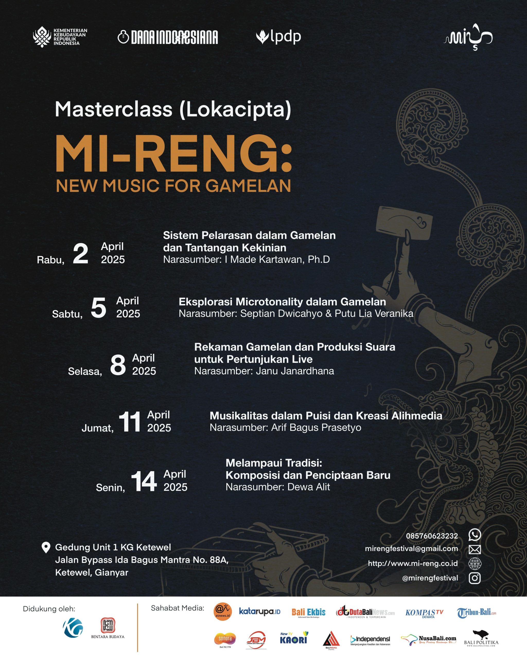 Sebagai bagian dari program Mi-Reng: New Music for Gamelan, masterclass ini terbuka bagi individu yang ingin mendalami eksplorasi gamelan dalam perspektif baru.