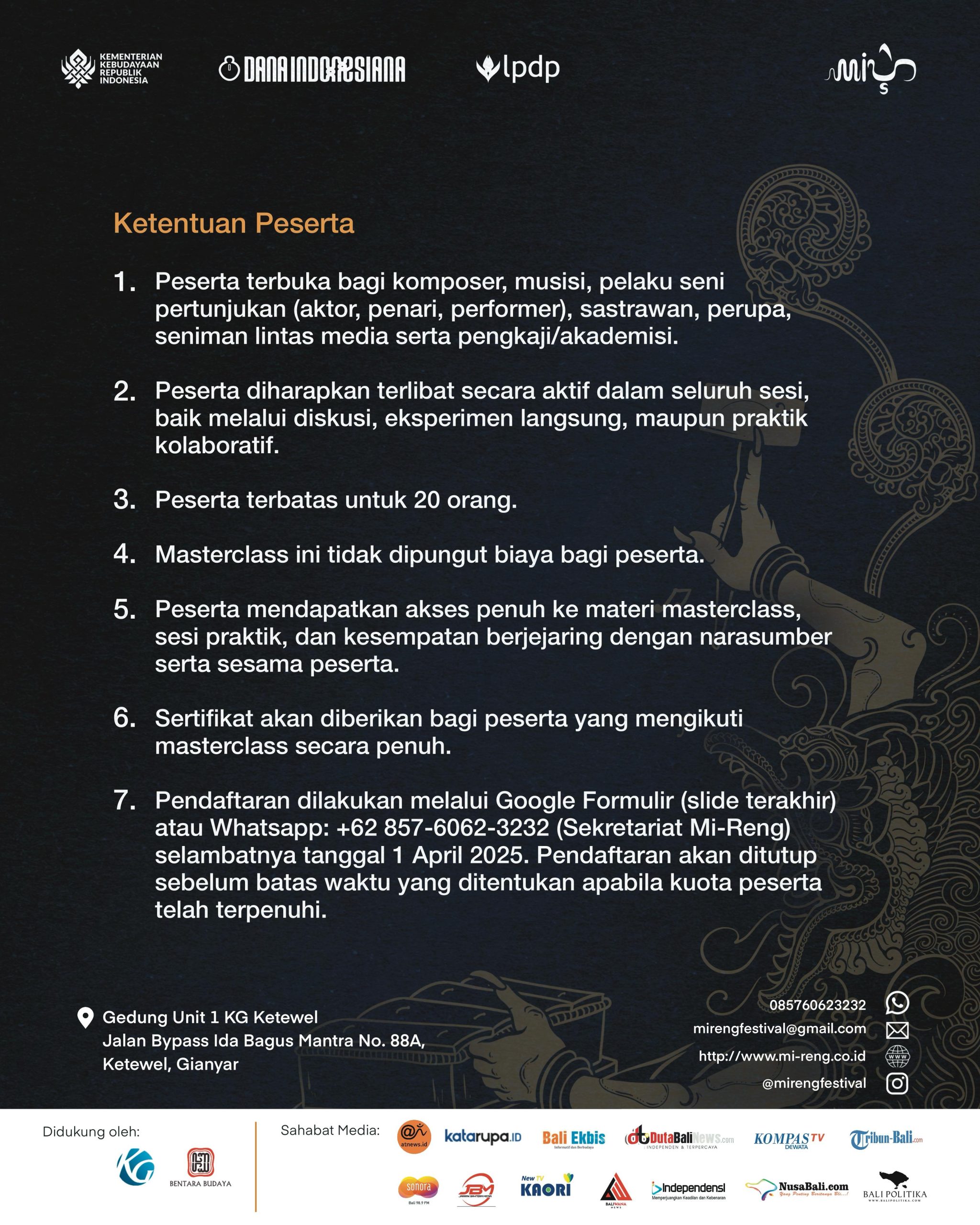 Adi Sumarna menambahkan, ketentuan peserta Masterclass diantaranya; 1) Peserta terbuka bagi komposer, musisi, pelaku seni pertunjukan (aktor, penari, performer), sastrawan, perupa, seniman lintas media serta pengkaji/akademisi; 2) Peserta diharapkan terlibat secara aktif dalam seluruh sesi, baik melalui diskusi, eksperimen langsung, maupun praktik kolaboratif; 3) Peserta terbatas untuk 20 orang; 4) Masterclass ini gratis/tidak dipungut biaya bagi peserta; 5) Peserta mendapatkan akses penuh ke materi masterclass, sesi praktik, dan kesempatan berjejaring dengan narasumber serta sesama peserta; 6) Sertifikat akan diberikan bagi peserta yang mengikuti masterclass secara penuh; 7) Pendaftaran dilakukan melalui Whatsapp: +62 857-6062-3232 (Sekretariat Mi-Reng) selambatnya tanggal 1 April 2025.