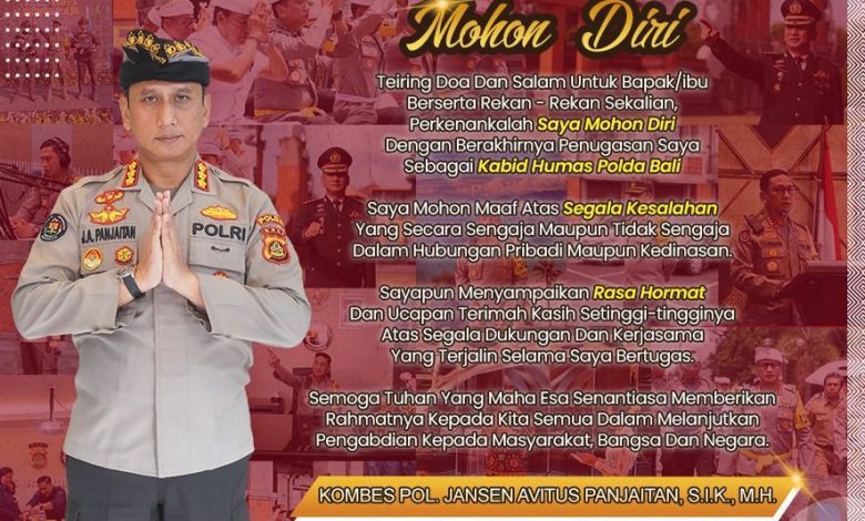 Jbm.co.id-DENPASAR | Kombes Pol. Jansen Avitus Panjaitan, S.I.K.,M.H., mohon undur diri seiring berakhirnya tugas sebagai Kabid Humas Polda Bali.