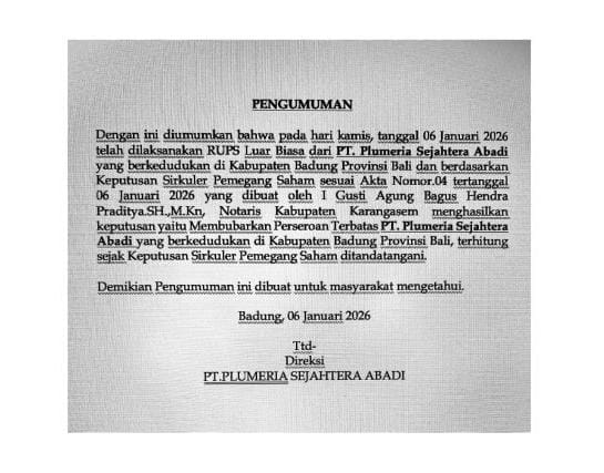 Jbm.co.id-BADUNG | Dengan ini diumumkan bahwa pada hari Kamis, tanggal 06 Januari 2026 telah dilaksanakan RUPS Luar Biasa dari PT. Plumeria Sejahtera Abadi yang berkedudukan di Kabupaten Badung Provinsi Bali dan berdasarkan Keputusan Sirkuler Pemegang Saham sesuai Akta Nomor.04 tertanggal 06 Januari 2026 yang dibuat oleh I Gusti Agung Bagus Hendra Praditya, SH.,M.,Kn., Notaris Kabupaten Karangasem menghasilkan keputusan yaitu Membubarkan Perseroan Terbatas PT. Plumeria Sejahtera Abadi yang berkedudukan di Kabupaten Badung Provinsi Bali, terhitung sejak Keputusan Sirkuler Pemegang Saham ditandatangani. Demikian Pengumuman ini dibuat untuk masyarakat mengetahui.