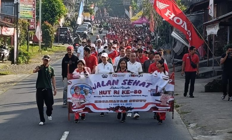 Jbm.co.id-BANGLI | Dalam rangka memeriahkan Hari Ulang Tahun (HUT) Proklamasi Kemerdekaan Republik Indonesia ke-80, Pemerintah Kecamatan Susut menggelar acara jalan sehat dan senam aerobik yang dipusatkan di Lapangan Umum Kecamatan Susut Kabupaten Bangli, Jumat, 22 Agustus 2025.